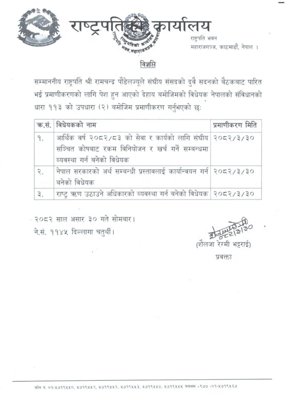 प्रमाणीकरण भएका विधेयकहरूमा ‘आर्थिक वर्ष २०८२/८३ को सेवा र कार्यका लागि संघीय सञ्चित कोषबाट रकम विनियोजन र खर्च गर्ने सम्बन्धमा व्यवस्था गरेको विधेयक’, ‘नेपाल सरकारको अर्थ सम्बन्धी प्रस्तावलाई कार्यान्वयन गर्न बनेको विधेयक’ र ‘राष्ट्र ऋण उठाउने अधिकारको व्यवस्था गर्न बनेको विधेयक’ रहेका छन् ।