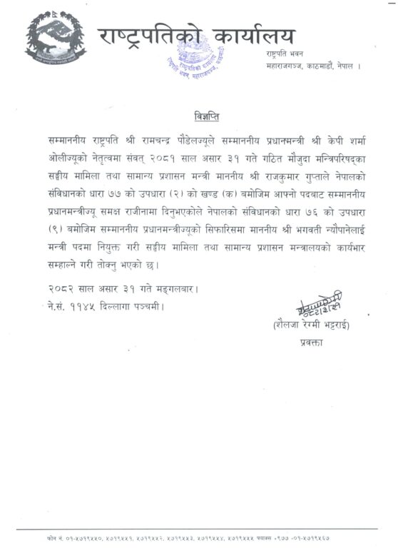 ‘नेपालको संविधानको धारा ७७ को उपधारा (२) को खण्ड (क) बमोजिम आफ्नो पदबाट सम्माननीय प्रधानमन्त्रीज्यू समक्ष राजीनामा दिनुभएकोले नेपालको संविधानको धारा ७६ को उपधारा (९) बमोजिम सम्माननीय प्रधानमन्त्रीज्यूको सिफारिसमा माननीय श्री भगवती न्यौपानेलाई मन्त्री पदमा नियुक्त गरी सङ्घीय मामिला तथा सामान्य प्रशासन मन्त्रालयको कार्यभार सम्हाल्ने गरी तोक्नु भएको छ,’राष्ट्रपति कार्यालयकी प्रवक्ता शैलजा रेग्मी भट्टराईद्वारा हस्ताक्षरित विज्ञप्तिमा भनिएको छ ।