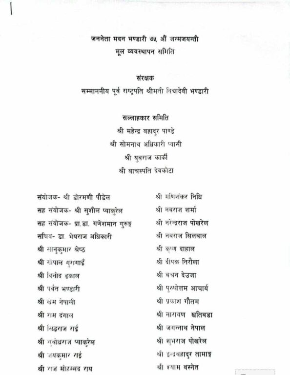 पहिलो चरणमा स्वर्गीय नेता मदन भण्डारीको ७५औं जयन्ती मूल व्यवस्थापन समिति गठन भएको छ । विद्यादेवी भण्डारी प्रमुख संरक्षक रहेको समितिको संयोजकमा बागमती प्रदेशका पूर्वमुख्यमन्त्री डोरमणि पौडेल छन् ।