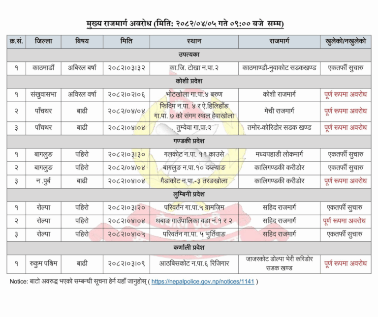 पाँचथरकै तुम्वेवा गाउँपालिका-२ मा बाढीका कारण तमोर करिडोर सडकखण्ड पूर्ण रूपमा अवरुद्ध छ । नवलपरासी पूर्वको गैँडाकोट नगरपालिका-३, तरङखोलामा बाढीका कारण कालीगण्डकी करिडोर पूर्ण रूपमा अवरुद्ध छ । रोल्पाको थबाङ गाउँपालिका-१ र २ मा पहिरो खस्दा सहिद राजमार्ग पूर्ण रूपमा अवरुद्ध रहेको प्रहरीले जनाएको छ ।