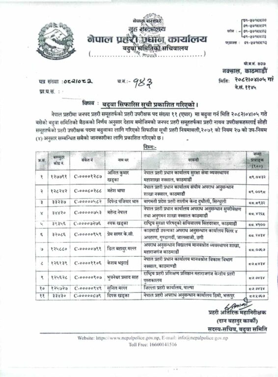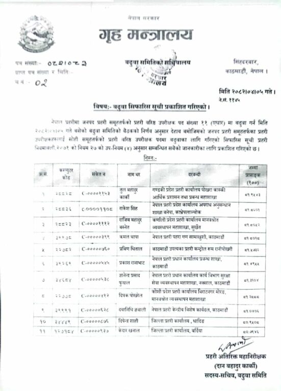 बढुवा सिफारिसमा ११ जना एसएसपी/एसपी र १३ जना डीएसपी परेका छन्।