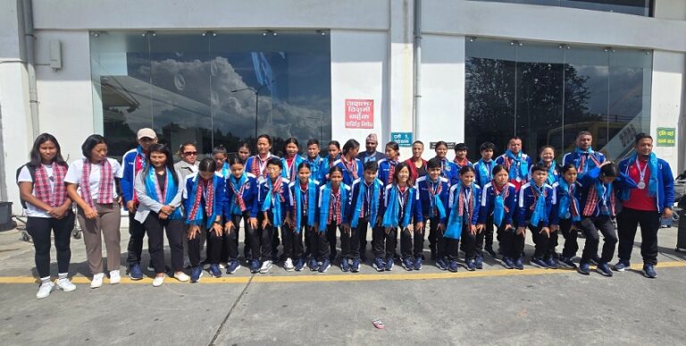 काठमाडौं । २० वर्षमुनिको साफ महिला च्याम्पियनशिप खेलेर नेपाली टोली आज स्वदेश फर्किएको छ । टोलीलाई त्रिभुवन अन्तर्राष्ट्रिय विमानस्थलमा अखिल नेपाल फुटबल सङ्घ (एन्फा) की केन्द्रीय सदस्य तथा महिला कमिटी संयोजक सरिला श्रेष्ठ मलेकु र प्रवक्ता सुरेश शाहले स्वागत गरे ।