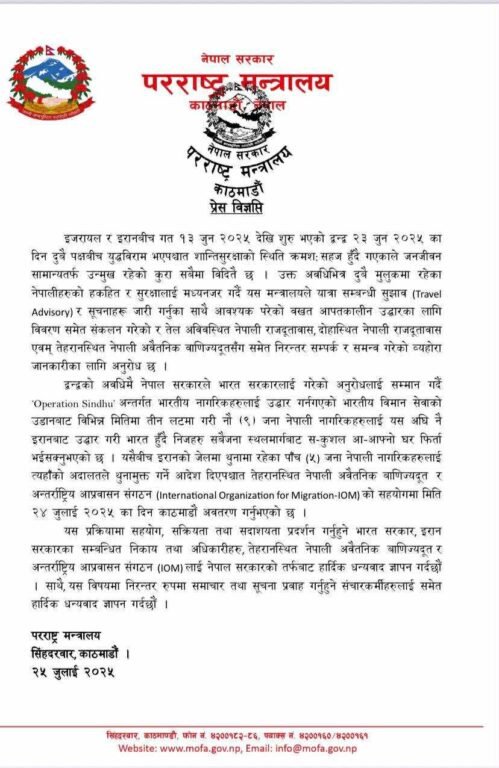 हालैको इजरायल इरान युद्धका कारण नेपाली नागरिकको सुरक्षा एवं उद्धारका क्रममा इरानको जेलमा पाँच जना नेपाली रहेको पत्ता लागेको थियो ।
