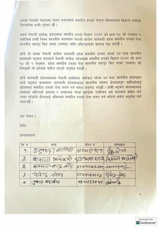 यो चुनौति आएपछि आज शुक्रबार कांग्रेस संसदीय दलका नेताविरुद्ध संसदीय दलको विधान २०७४ को धारा १८ को उपधारा ६ बमोजिम अविश्वासको प्रस्ताव दर्ता भएको हो । त्यसअघि चारजना मन्त्री मधु श्रेष्ठ, मीनकृष्ण महर्जन, विमल ठकुरी र सुरजचन्द्र लामिछानेले मख्यमन्त्री लामालाई राजीनामा बुझाएका थिए ।