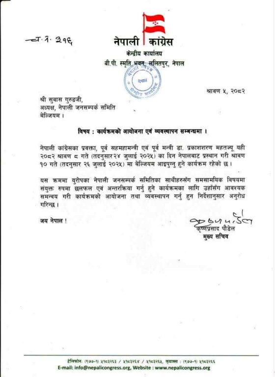 नेपाली कांग्रेसले नेपाली जनसम्पर्क समिति,बेल्जियमका सभापति सुबाश गुरुङलाई पत्राचार गर्दै पार्टी नेता महत युरोपमा रहँदा उहाँको अन्य कार्यक्रमको व्यवस्थापन गर्न जिम्मेवारी दिइएको छ। पत्रमा भनिएको छ- ‘बेल्जियममा रहँदा युरोपका नेपाली जनसम्पर्क समितिका साथीहरुसँग समसामयिक विषयमा संयुक्त रुपमा छलफल र अन्तरक्रिया गर्नु हुने कार्यक्रमका लागि नेता महतसँग आवश्यक समन्वय गरी कार्यक्रमको आयोजना तथा व्यवस्थापन गर्नुहुन निर्देशनानुसार अनुरोध गरिन्छ। ‘