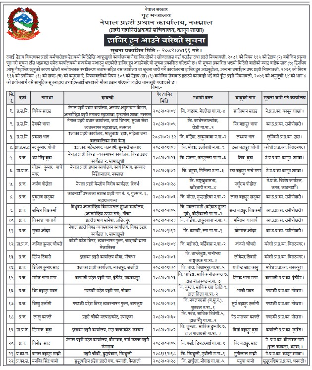 नेपाल प्रहरी प्रधान कार्यालय नक्सालले आइतवार सूचना जारी गर्दै गैर हाजिरी रहेका २२ जना प्रहरीहरूलाई स्पष्टीकरणसहित सात दिनभित्र सम्पर्कमा आउन आग्रह गरेको हो।
