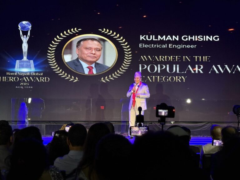 काठमाडौं । नेपाल विद्युत प्राधिकरणका पूर्वकार्यकारी निर्देशक कुलमान घिसिङलाई अमेरिकाको न्यूयोर्कमा आयोजित एक विशेष समारोहमा ’ग्लोबल हिरो अवार्ड’ प्रदान गरिएको छ। प्रवासी नेपालीहरूको संस्था ‘हामी नेपाली ग्लोबल’ले उनलाई यो सम्मान प्रदान गरेको हो।