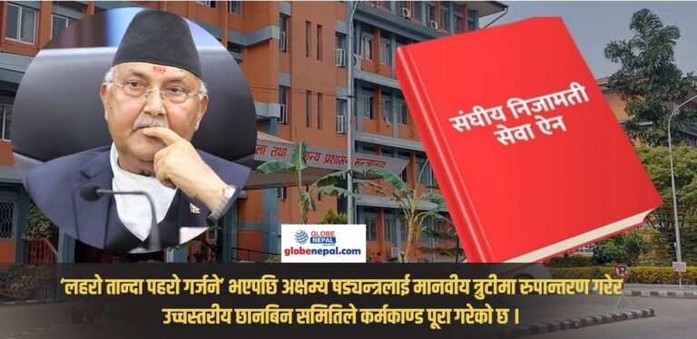 काठमाडौं । संघीय निजामति सेवा विधेयकमा व्यवस्था गरिएको ‘कुलिङ अफ पिरियड’मा भएको गडबडी मानवीय त्रुटीमा सीमित गरेर उच्चस्तरीय संसदीय छानबिन समितिले साउन १९ गते प्रतिवेदन सभामुख देवराज घिमिरेलाई बुझाउँदैछ । ‘लहरो तान्दा पहरो गर्जने’ भएपछि अक्षम्य षड्यन्त्रलाई मानवीय त्रुटीमा रुपान्तरण गरेर उच्चस्तरीय छानबिन समितिले कर्मकाण्ड पूरा गरेको छ ।