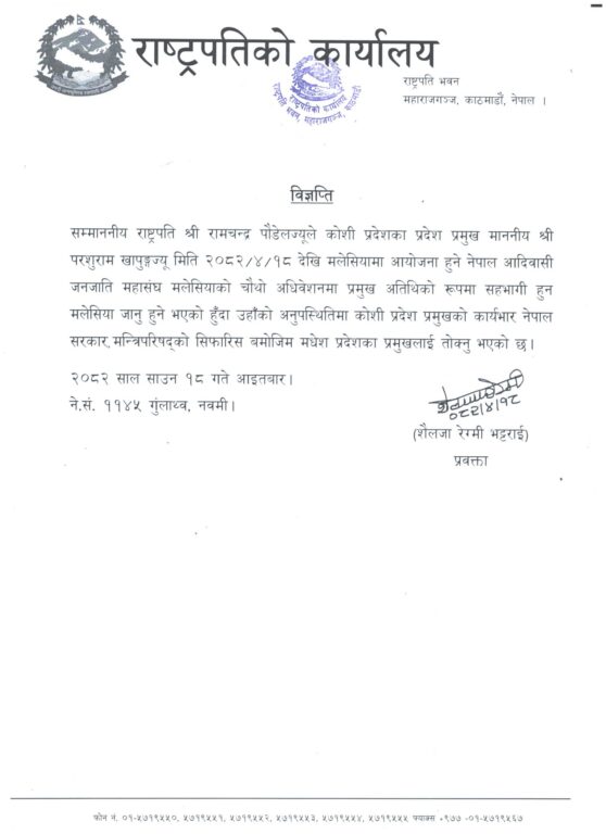 काठमाडौं । राष्ट्रपति रामचन्द्र पौडेलले कोशी प्रदेशका प्रदेश प्रमुख परशुराम खापुङ्ग आइतबार मलेसिया जाने भएपछि उनको अनुपस्थितिमा मधेश प्रदेश प्रमुख सुमित्रा सुवेदी भण्डारीलाई प्रमुखको कार्यभार तोकेका छन् ।