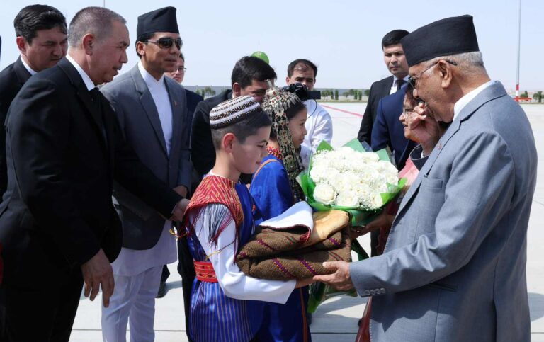 प्रधानमन्त्री ओली नेतृत्वको टाेली स्थानीय समयअनुसार दिउँसो १४.३० बजे दुबई अन्तर्राष्ट्रिय विमानस्थलहुँदै तुर्कमेनिस्तानको आवाज शहर पुगेको हो ।