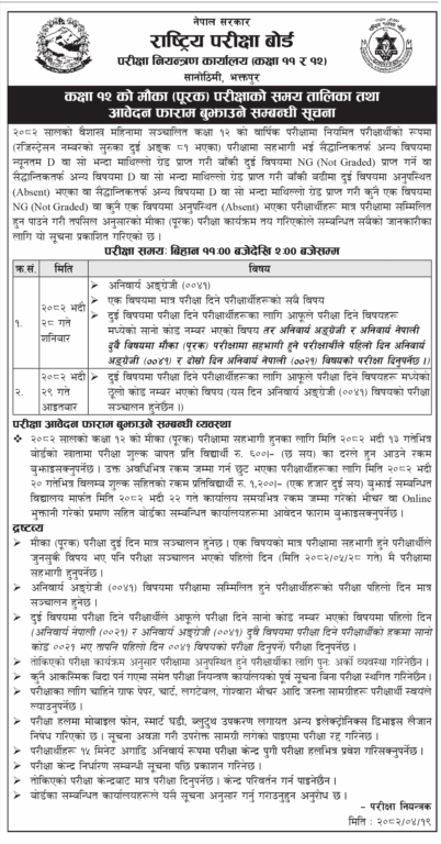 काठमाडौं । राष्ट्रिय परीक्षा बोर्डले कक्षा १२ को मौका (पूरक) परीक्षाको तालिका सार्वजनिक गरेको छ । गत वैशाखमा सञ्चालित वार्षिक परीक्षामा दुई विषयसम्म ‘नन ग्रेडेड’प्राप्त गरेका वा अनुपस्थित भएका विद्यार्थीहरूका लागि बोर्डले पूरक परीक्षाको अवसर दिएको हो ।