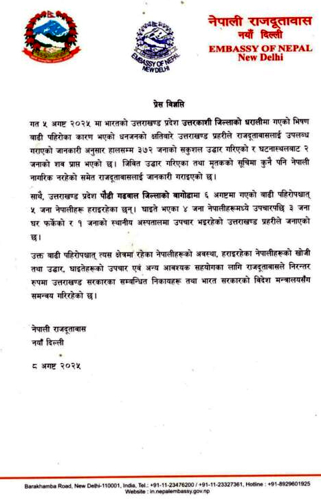 उत्तराखण्ड प्रहरीले घटनास्थलबाट दुईजनाको शव फेला परेको र ३७२ जनाको सकुशल उद्धार गरिएको जनाएको छ। नेपाली दूतावासलाई दिएको जानकारीअनुसार, धराली घटनामा हालसम्म नेपाली नागरिक नरहेको बताइएको छ।
