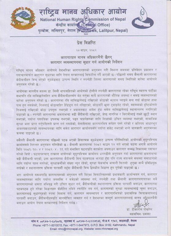 यसैगरी कैलाली कारागारमा पछिल्लो पटक भएको हिंसात्मक मुठभेडबाट उत्पन्न परिस्थितिको आयोगको सुदूरपश्चिम कार्यालयले निरन्तर अनुगमन गरिरहेको आयोगको भनाइ छ ।