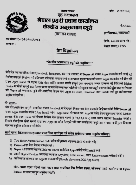 प्रहरीले अपरिचित लिंक वा एप नखोल्न, सतर्क रहन र यस्तो घटना भए तत्काल बैंक, नजिकको प्रहरी कार्यालय वा साइबर ब्युरोलाई जानकारी दिन आग्रह गरेको छ।