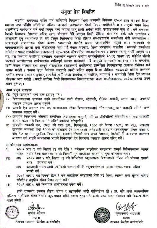 काठमाडौं । शिक्षा विधेयकमा पाँचबुँदे माग राख्दै निजी विद्यालयका सञ्चालकहरूले आन्दोलन घोषणा गरेका छन् ।