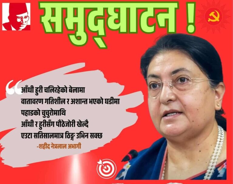 काठमाडौं । नेकपा एमालेमा पुनः फर्केर राजनीतिमा प्रवेश गर्न लागेकी पुर्व राष्ट्रपति बिधादेवी भण्डारीले आफ्नो सम्पर्क कार्यालय भाेलि उद्घाटन गर्दैछिन् ।