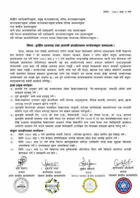 संयुक्त विज्ञप्ति अनुसार भदौ ८ देखि १२ गतेसम्म तयारी बैठक, प्रदेश र जिल्लास्तरीय विरोध, अन्तरक्रिया, कोणसभा तथा १२ गते विद्यालय बन्दसम्मको चेतावनी दिइएको छ।
