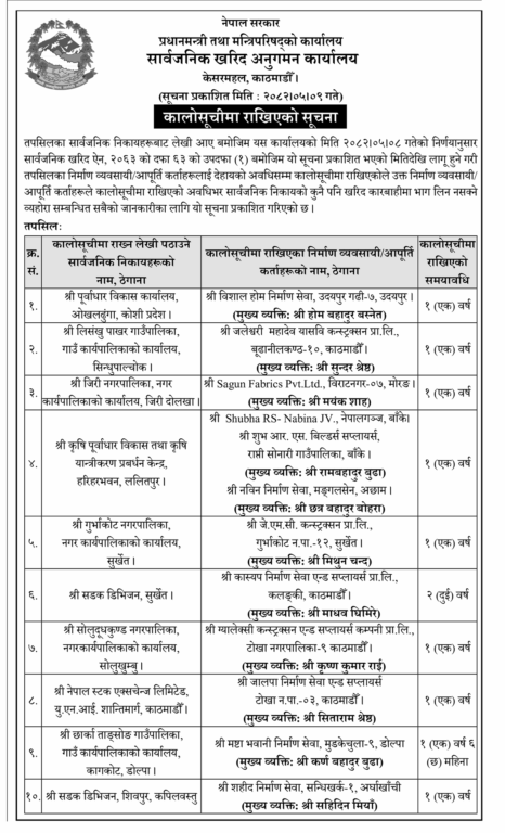 कालोसूचीमा राखिएका उक्त निर्माण कम्पनी तथा व्यवसायीहरूले कालोसूचीमा राखिएको अवधिभर कुनै पनि खरिद कारबाहीमा भाग लिन नपाइने सूचनामा उल्लेख छ । कार्यालयका अनुसार १ देखि २ वर्षसम्मका लागि कालोसूचीमा राखिएको छ।