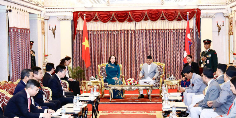 काठमाडौं । राष्ट्रपति रामचन्द्र पौडेलसँग नेपाल भ्रमणमा रहेकी समाजवादी गणतन्त्र भियतनामका उपराष्ट्रपति वो थि आन्ह सुआनले आज शिष्टाचार भेट गरेकी छन् ।
