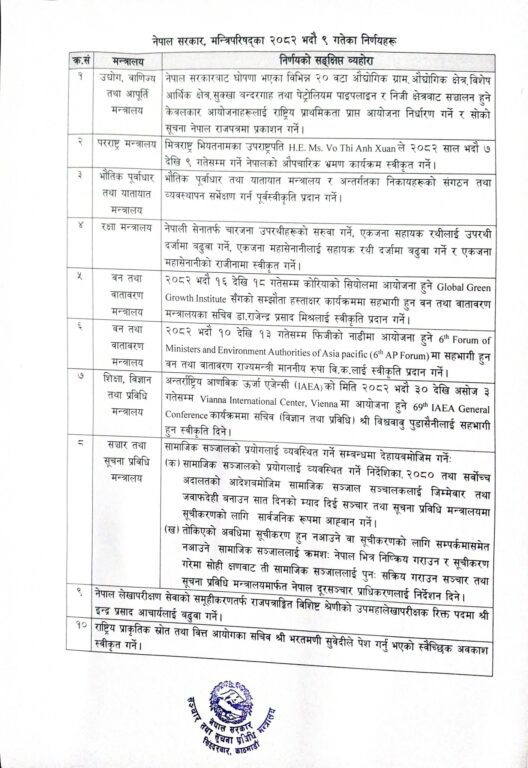 काठमाडौं । मन्त्रिपरिषद्को गत सोमबार बसेको बैठकले सामाजिक सञ्जालको प्रयोगलाई व्यवस्थित गर्न महत्त्वपूर्ण दुई निर्णय गरेकाे छ ।