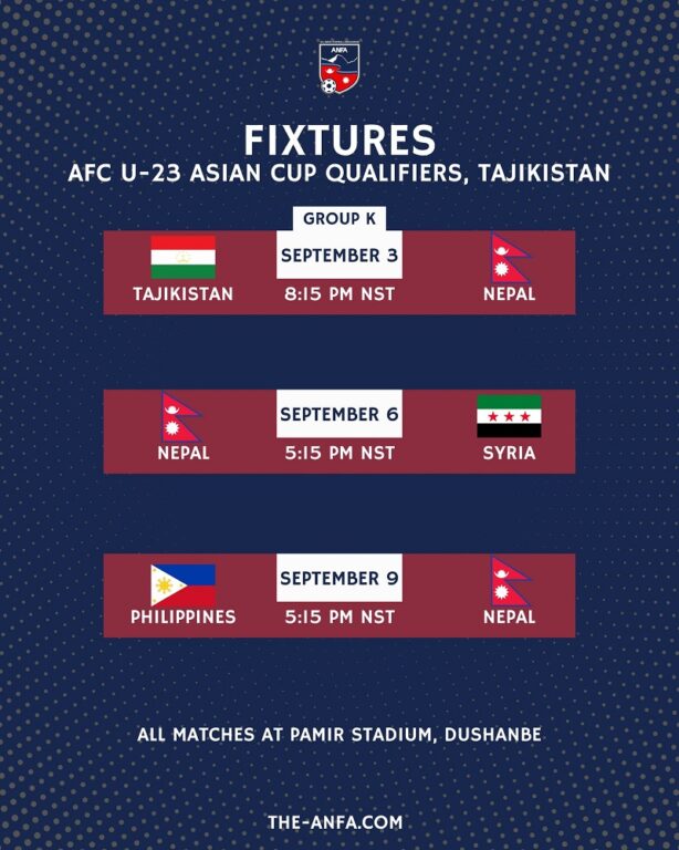 काठमाडौं । ताजकिस्तानमा हुने एएफसी २३ वर्षमुनिको एशियन कप छनोटका लागि नेपालको खेल तालिका सार्वजनिक भएको छ ।