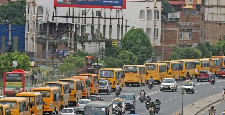 चक्रपथको एक लेनमा निजी विद्यालयहरुका पहेँला बसहरु लस्कर लागेका छन् ।