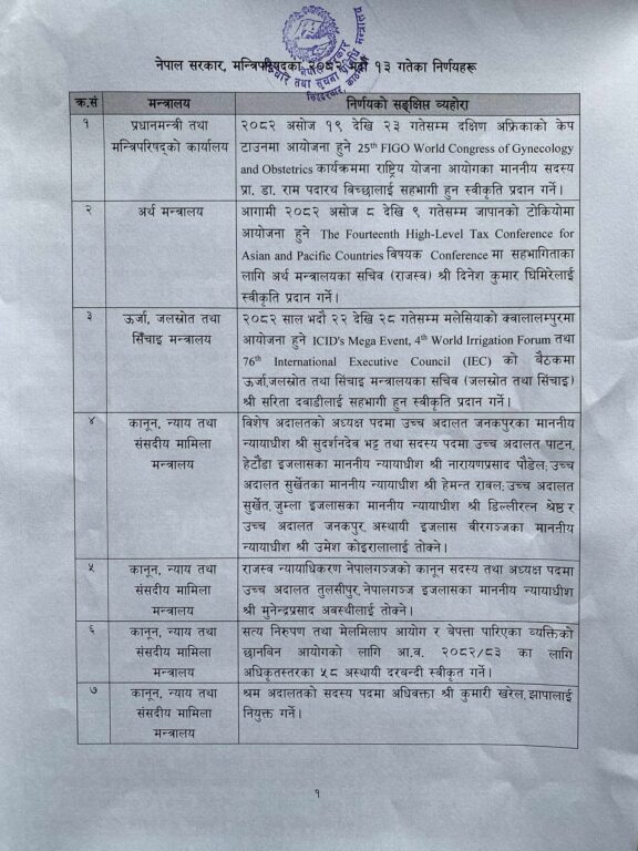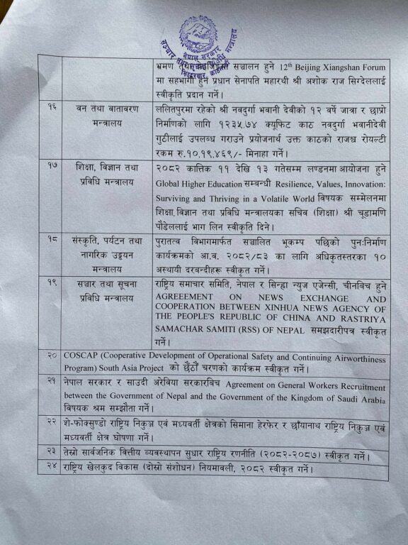 काठमाडौं । सरकारले मन्त्रिपरिषद् बैठकका निर्णय सार्वजनिक गरेको छ । भदौ १३ गते बसेको मन्त्रिपरिषद्का बैठकका निर्णय सरकारका प्रवक्ता एवम् सञ्चार तथा सूचना प्रविधिमन्त्री पृथ्वी सुब्बा गुरुङले मंगलबार सार्वजनिक गरेका हुन् ।