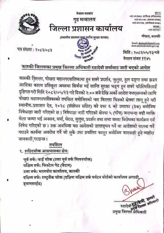 पोखरा । जेनजी आन्दोलन चर्किँदै गएपछि पोखरामा पनि स्थानीय प्रशासनले कर्फ्यु लगाएको छ । प्रमुख जिल्ला अधिकारी रुद्रदेवी शर्माले सोमबारदेखि लागु हुने गरी कर्फ्यु आदेश जारी गरेकी हुन् ।