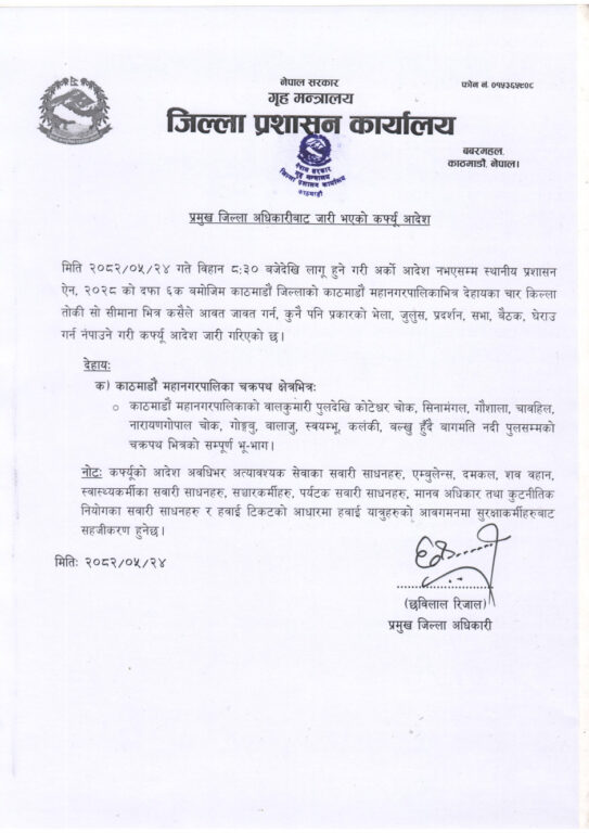 काठमाडौं । जिल्ला प्रशासन कार्यालय काठमाडौंले अर्को आदेश जारी नहुँदासम्मका लागि कर्फ्यु आदेश जारी गरेको छ । बिहान साढे ८ बजेदेखि लागु हुने कर्फ्यु अर्को आदेश नआउँदासम्म लागु हुनेछ ।
