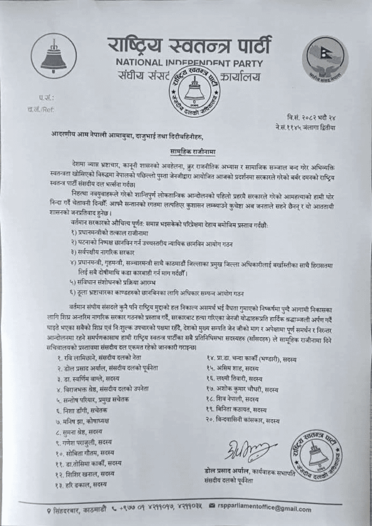 काठमाडौं । राष्ट्रिय स्वतन्त्र पार्टी (रास्वपा) का २० जना सांसदले सामूहिक राजीनामा दिएका छन् । जेनजी पुस्ताद्वारा सुरु गरिएको शान्तिपूर्ण आन्दोलनमाथि सरकारले गरेको दमन र दर्जनौं युवाको ज्यान गएपछि रास्वपाले यस्तो कदम चालेको हो ।