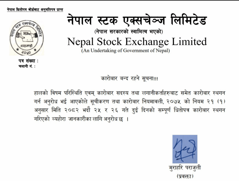काठमाडौँ । नेपाल स्टक एक्सचेञ्ज (नेप्से) दुई दिनका लागि बन्द हुने भएको छ। नेप्सेले सोमबार एक विज्ञप्ति जारी गर्दै आगामी भदौ २५ र २६ गते दुई दिन सम्पूर्ण धितोपत्र कारोबार स्थगित गरिएको जानकारी दिएको हो ।