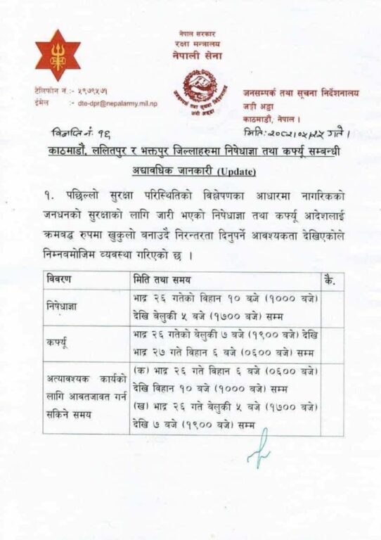 यस्तै भदौ २६ गते बिहीबार बेलुकी ७ बजेदेखि भदौ २७ गते शुक्रबार बिहान ६ बजेसम्म कर्फ्यू आदेश जारी गरेको सेनाले जनाएको छ ।