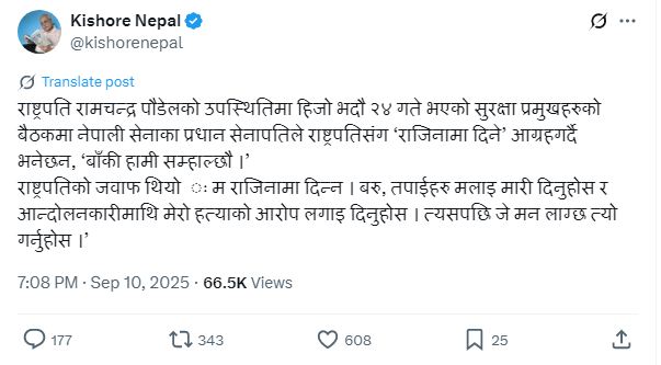 ‘राष्ट्रपति रामचन्द्र पौडेलको उपस्थितिमा हिजो भदौ २४ गते भएको सुरक्षा प्रमुखको बैठकमा नेपाली सेनाका प्रधान सेनापतिले राष्ट्रपतिसँग ‘राजीनामा दिने’ आग्रह गर्दै भने छन, ‘बाँकी हामी सम्हाल्छौँ,’ पत्रकार नेपालले लेखका छन्, ‘राष्ट्रपतिको जवाफ थियो : म राजीनामा दिन्न । बरू, तपाईंहरू मलाइ मारी दिनुहोस् र आन्दोलनकारीमाथि मेरो हत्याको आरोप लगाई दिनुहोस् । त्यसपछि जे मन लाग्छ त्यो गर्नुहोस् ।’