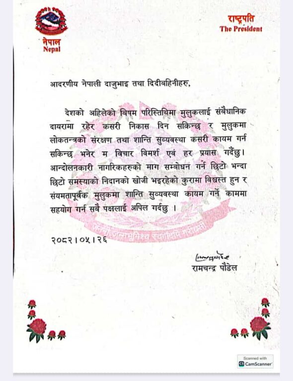राष्ट्रपति पौडेलले भनेका छन्, देशको अहिलेको विषम परिस्थितिमा मुलुकलाई संवैधानिक दायरामा रहेर कसरी निकास दिन सकिन्छ र मुलुकमा लोकतन्त्रको संरक्षण तथा शान्ति सुव्यवस्था कसरी कायम गर्न सकिन्छ भनेर म विचार विमर्श एवं हर प्रयास गर्दैछु । आन्दोलनकारी नागरिकहरूको माग सम्बोधन गर्न छिटोभन्दा छिटो समस्याको निदानको खोजी भइरहेको कुरामा विश्वस्त हुन र संयमतापूर्वक मुलुकमा शान्ति सुव्यवस्था कायम गर्ने काममा सहयोग गर्न सबै पक्षलाई अपील गर्दछु ।