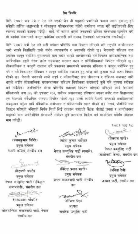 नेपाली कांग्रेस, नेकपा एमाले, नेकपा माओवादी केन्द्र, नेकपा एकीकृत समाजवादी, जसपा, जनमत पार्टी, लोकतान्त्रिक समाजवादी पार्टी र नागरिक उन्मुक्ति पार्टीले संयुक्त विज्ञप्ति जारी गर्दै प्रतिनिधिसभा विघटनलाई संविधानमाथिको प्रहार भएकाे बताएका छन् ।
