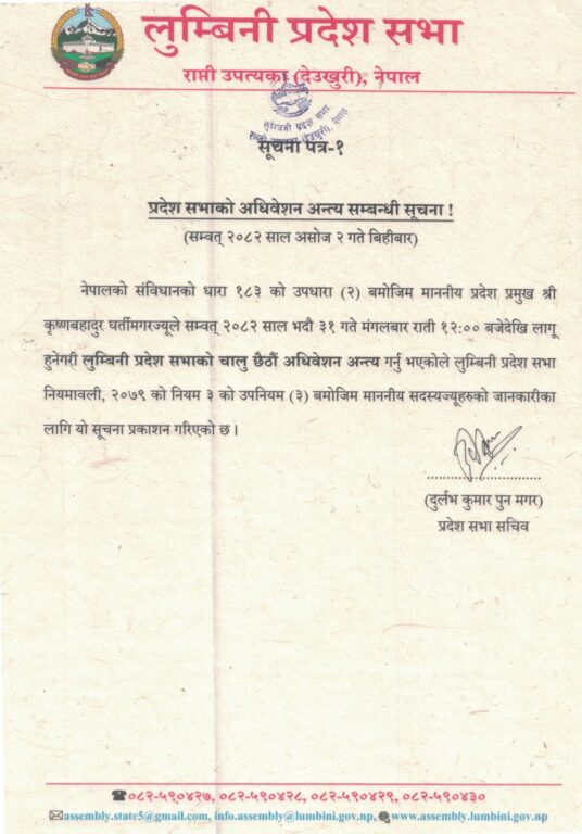 नेपालको संविधानको धारा १८३ को उपधारा २ बमोजिम प्रदेश प्रमुख घर्तिमगरले अधिवेशन अन्त्य गरेको र लुम्बिनी प्रदेशसभा नियमावली, २०७९ को नियम ३ उपनियम ३ बमोजिम प्रदेशसभा सदस्यलाई अधिवेशन अन्त्य भएको जानकारीका लागि सूचना प्रकाशित गरिएको सूचनामा उल्लेख छ ।