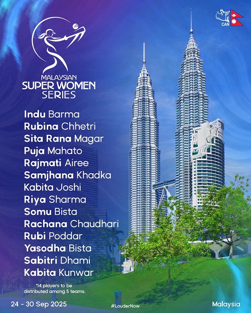 काठमाडौं । नेपाली महिला क्रिकेट खेलाडीले मलेशियन सुपर वुमन शृङ्खला खेल्ने भएको छ । मलेशियन सुपर वुमन शृङ्खला आउँदो सेप्टेम्बर २४ देखि ३० अर्थात् असोज ९ गतेदेखि १४ गतेसम्म मलेशियामा हुनेछ ।