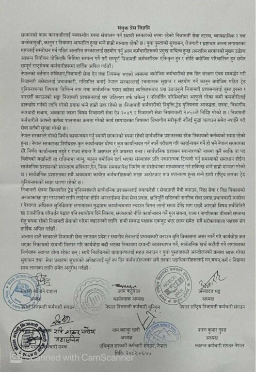 काठमाडौं। निजामती कर्मचारीका ६ वटा ट्रेड युनियनहरूले पछिल्लो समय सार्वजनिक प्रशासन रुपान्तरणको नाममा कुनै व्यक्ति वा पद विशेषको बर्खास्ती वा राजीनामा माग्ने प्रवृत्ति रोक्न ध्यानाकर्षण गराएका छन्।