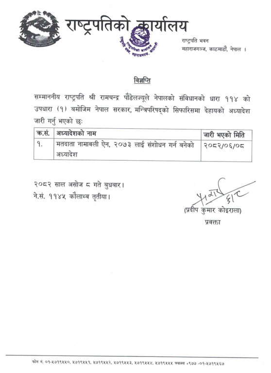 सरकारको सिफारिसमा राष्ट्रपति पौडेलले आगामी फागुन २१ गते हुने निर्वाचनका लागि मतदाता नामावली ऐन सम्बन्धी अध्यादेश जारी गरेका हुन् ।