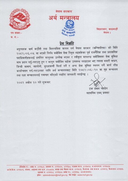 अनुत्पादक खर्च कटौती तथा मितव्ययिता कायम गर्न गएको असोज ५ को मन्त्रिपरिषद् बैठकबाट भएको निर्णय अनुसार पूर्वपदाधिकारीलाई प्रचलित कानूनमा उल्लेख भएका र स्वीकृत मापदण्ड बमोजिमका सेवा सुविधा मात्र प्रदान गर्न/गराउन अर्थ मन्त्रालयले भनेको हो ।