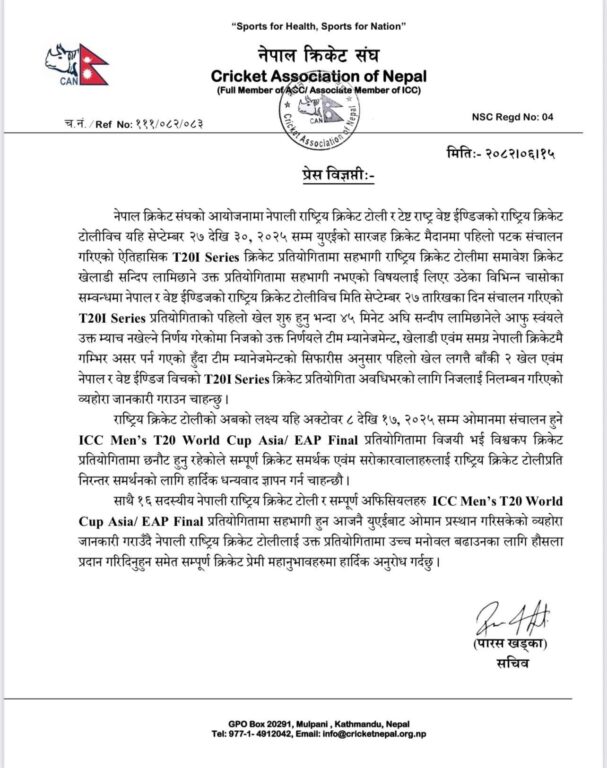 काठमाडौँ। नेपाल क्रिकेट संघ (क्यान)ले सन्दीप लामिछानेले वेस्ट इन्डिजसँगको सिरिज नखेल्नुको कारण सार्वजनिक गरेको छ।