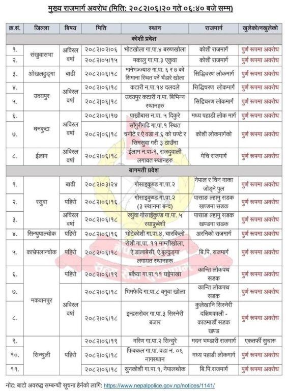 यसैगरी बागमती प्रदेशमा पासाङ ल्हामु सडक, अरनिको राजमार्ग, बीपी राजमार्ग, कान्ति लोकपथ, मदन भण्डारी राजमार्ग, मध्यपहाडी लोकमार्गहरु बन्द छन् ।