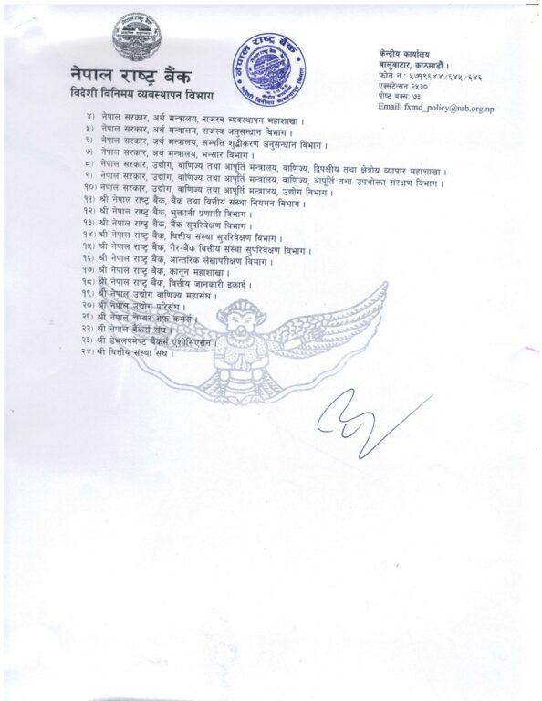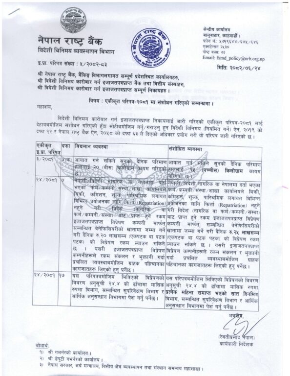 त्यस्तै राष्ट्र बैंकले विदेशबाट आउने विप्रेषण (रेमिट्यान्स) को भुक्तानी सीमामा पनि परिवर्तन गरेको छ । राष्ट्र बैंकको विदेशी विनिमय व्यवस्थापन विभागले आज जारी गरेको नयाँ परिपत्र अनुसार यी व्यवस्था लागू हुनेछ ।