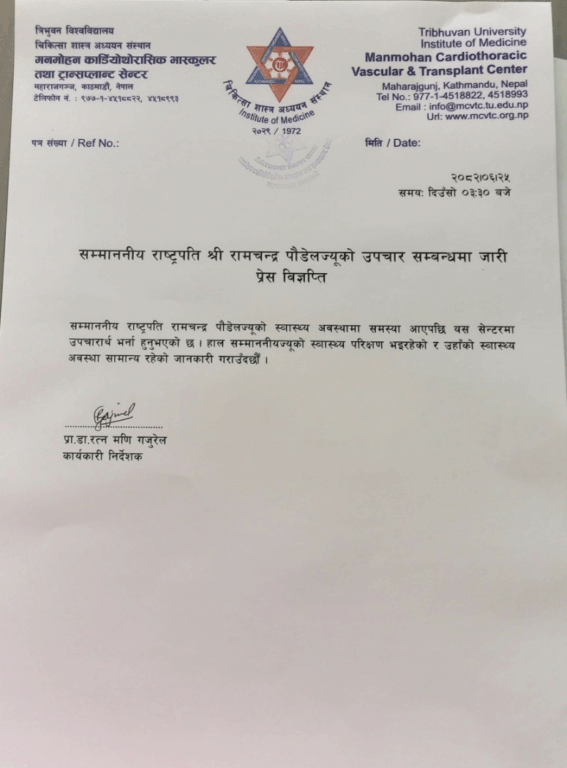 मनमोहन कार्डियोथोरासिक भास्कुलर तथा ट्रान्सप्लान्ट सेन्टरका कार्यकारी निर्देशक प्रा.डा.रत्न मणि गजुरेल विज्ञप्ति जारी गर्दै राष्ट्रपतिको उपचार भइरहेको बताएका हुन् ।