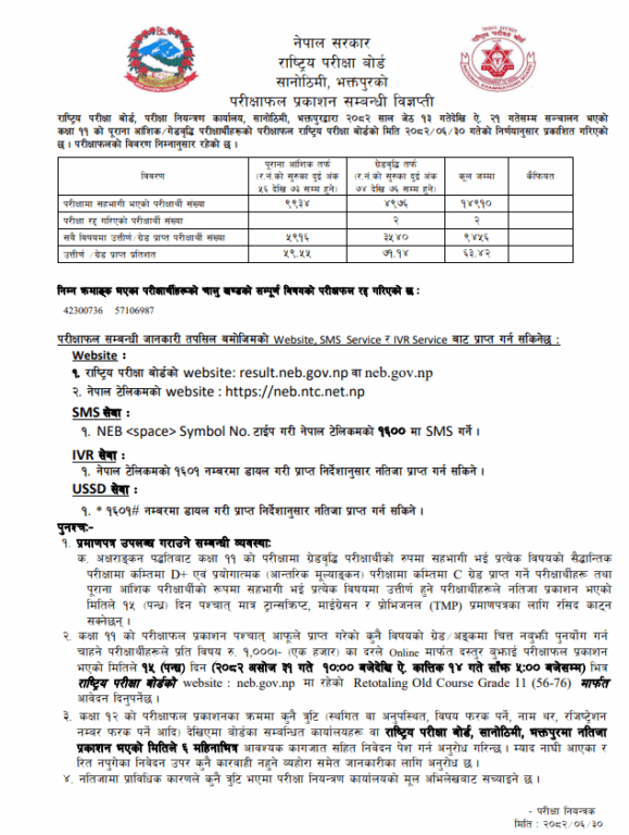 नतिजा राष्ट्रिय परीक्षा बोर्डको वेबसाइट वा नेपाल टेलिकमको १६०१ नम्बरमा डायल गरी प्राप्त निर्देशन अनुसार नतिजा प्राप्त गर्न सकिने छ ।