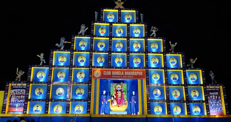 ‘जेनजी’ आन्दोलनपछि देशमा देखिएको राजनीतिक अस्थिरताबाट निराश जनतालाई भर्खरै राष्ट्रिय क्रिकेट टोलीले दिएको उत्साह र खुसीलाई आत्मसात् गर्दै क्लब बाङ्गला भद्रपुरले पण्डाल निर्माण गरेको पूजा समितिका संयोजक विजय साहले बताए ।
