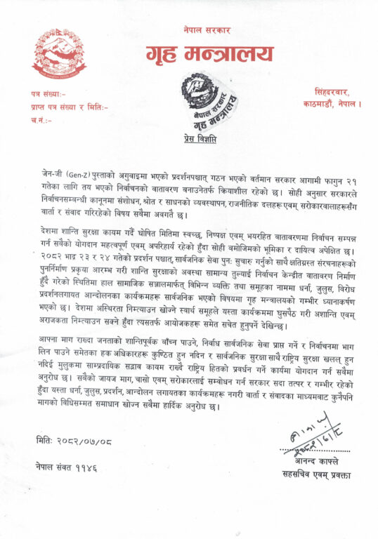 “हाल सामाजिक सञ्जालमार्फत् विभिन्न व्यक्ति तथा समूहका नाममा धर्ना, जुलुस, विरोध प्रदर्शनलगायत आन्दोलनका कार्यक्रमहरु सार्वजनिक भएको विषयमा गृह मन्त्रालयको गम्भीर ध्यानाकर्षण भएको छ । देशमा अस्थिरता निम्त्याउन खोज्ने स्वार्थ समूहले यस्ता कार्यक्रममा घुसपैठ गरी अशान्ति एवम् अराजकता निम्त्याउन सक्ने हुँदा त्यसतर्फ आयोजकहरु समेत सचेत हुनुपर्ने देखिन्छ,” विज्ञप्तिमा भनिएको छ ।