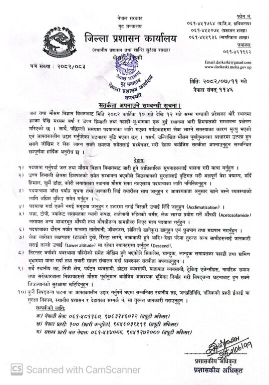 जिल्ला प्रशासन कार्यालय कास्कीले आज सार्वजनिक सूचनामार्फत आवश्यक सतर्कता अपनाउन सबैमा आग्रह गरेको हो । प्रतिकूल मौसमका कारण उत्पन्न हुनसक्ने जोखिम र लेक लाग्नसक्ने भएकाले अन्नपूर्ण आधार शिविर, मर्दी हिमाल, खुमै डाँडा, कोरीलगायतका ठाउँमा मौसम सफा नभएसम्म पदयात्रामा नजान प्रशासन कार्यालयकाे आग्रह छ ।