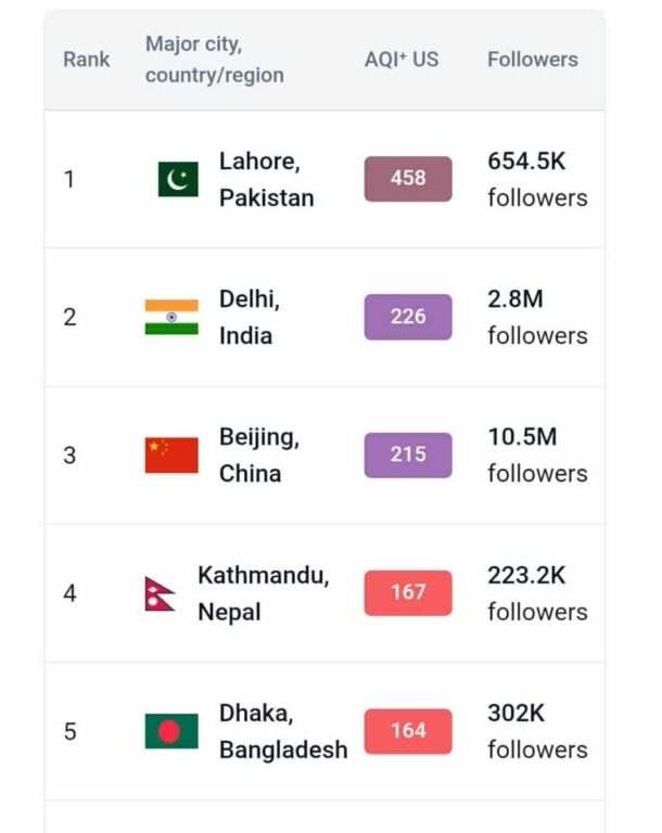 पहिलो नम्बरमा पाकिस्तानको लाहोर शहर रहेको छ । यहाँको वायु प्रदूषण ४५८ एक्यूआई मापन गरिएको छ ।