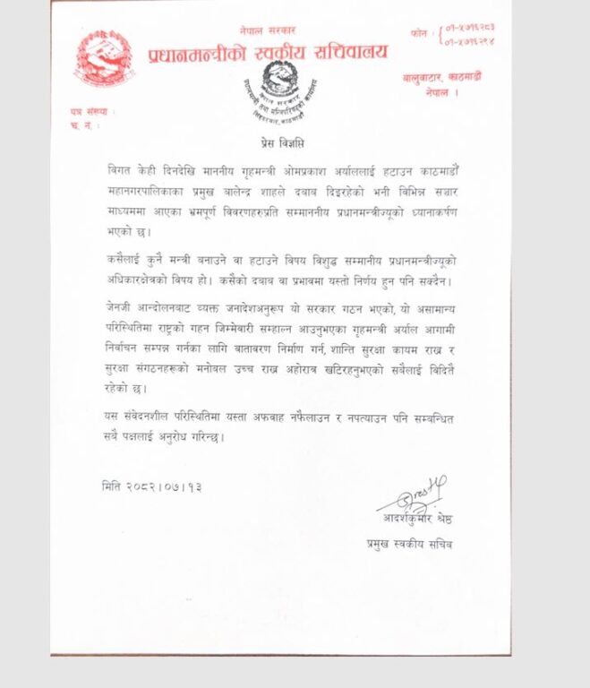 प्रमुख स्वकीय सचिव आदर्शकुमार श्रेष्ठले बिहीबार जारी गरेको विज्ञप्तिमा गृहमन्त्री अर्याललाई हटाउन काठमाडौँ महानगरपालिकाका प्रमुख बालेन्द्र शाहले दबाब दिइरहेको भनी विभिन्न सञ्चार माध्यममा आएका विवरणहरु भ्रमपूर्ण भएको भन्दै प्रधानमन्त्री सुशीला कार्कीको ध्यानाकर्षण भएको उल्लेख छ ।
